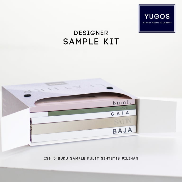 YUGOS have created a sample kit that is packaged professionally for you to easily bring to your project client meetings for only as low as IDR 99.000 for a full set (containing synthetic leather & fabric samples)